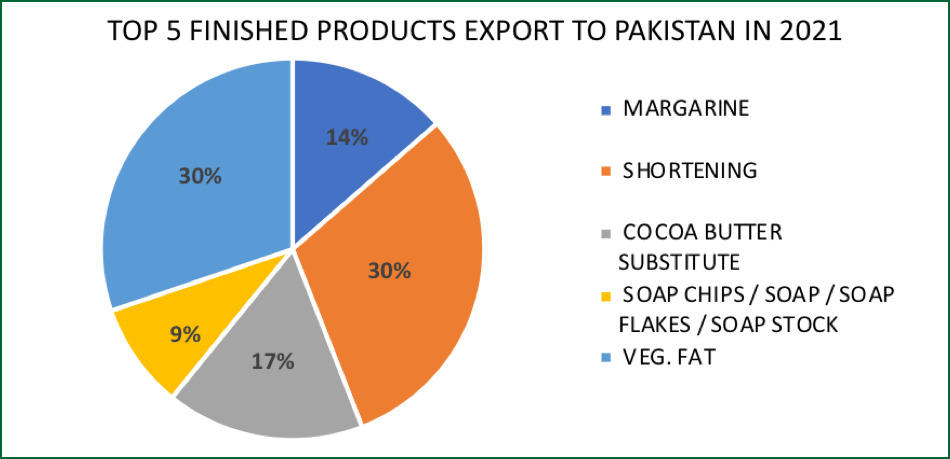 The demand of packaged food in Pakistan is projected to continue increasing backed by rising disposable income levels and stronger economic growth. This presents more opportunities for palm oil usage in the country as palm oil is the most preferred choice in the processed food sector in Pakistan. Malaysia is one of the main suppliers of palm oil to Pakistan and one of the palm oil products being exported are finished products. In 2021, total exports of Malaysian finished products to Pakistan amounted to 9,856 MT or RM57.71 million. Vegetable fats and shortening are the top 2 products exported followed by cocoa butter substitute, margarine and soap chips/flak as illustrated in the chart below. These products have become popular ingredients in many industries in Pakistan, among others, confectionary, packaged baked goods, bakery, snacks as well as biscuit industries.