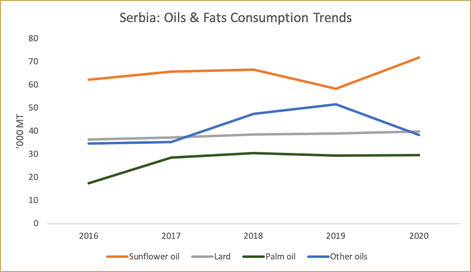 Sunflower oil CAGR for the 2016-2020 period was recorded at 3.7%. The increase in consumption of sunflower oil is mainly due to an increase in population as it is used for household, compared to palm oil for industrial usage. In addition, an increase in the production of finished products for exports supports the rise in palm oil consumption in the local market. However, for household usage, especially the liquid market, it is still challenging to penetrate it due to palm cooking oil’s physical appearance, which tends to crystallise during the cold season. Furthermore, sunflower oil is produced locally and readily available. Serbia is big in oilseed production, had around 650,000 MT in 2020 and exported more than 130,000 MT every year.
