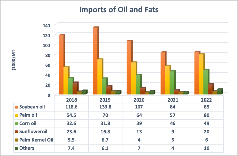 Palm oil and soybean oil are the two largest imported and consumed oils in Tunisia and collecitvley they account for nearly two thirds of the total import.