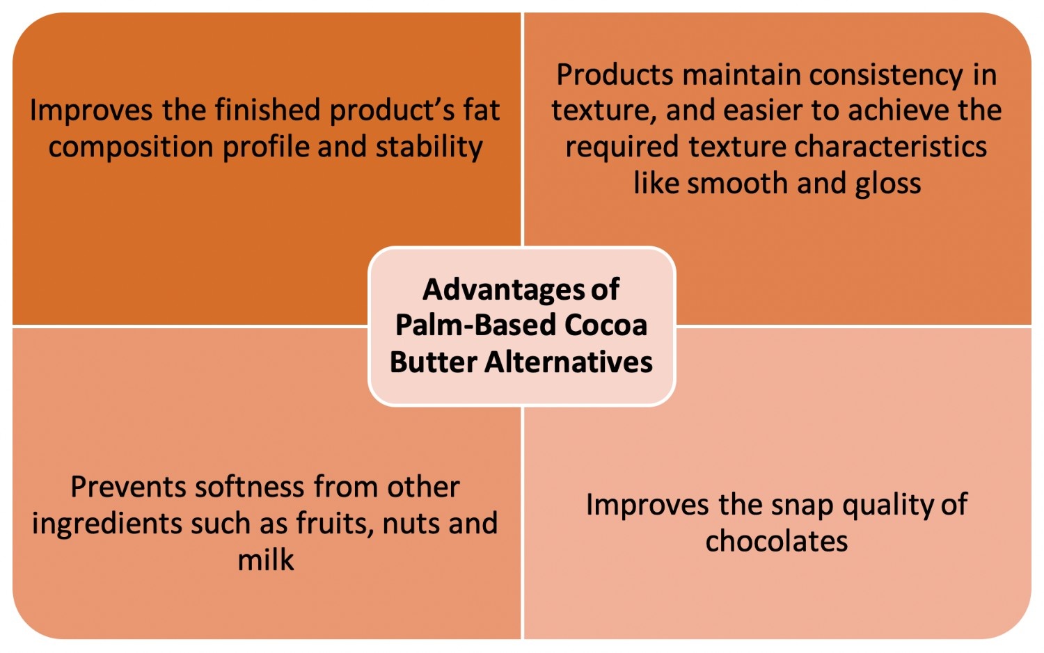 The biggest advantage of using palm fat as an alternative is due to its availability and potential cost reduction of the overall confectionery formulation. Also, cocoa butter and palm-based cocoa butter substitutes share the same unique melting characteristics, in which they remain solid at room temperature but melts at body temperature. The similar melting characteristic of palm-based cocoa butter alternatives gives a smooth and creamy texture in the mouth, just like cocoa butter. It is also widely used for coatings in chocolate.