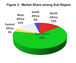 CPO, CPL accounted for 43% of the total MPO exported to the region. Duty differential between crude and refined product influence to offtake of these two components of palm oil. At present Kenya and Tanzania impose zero duty on crude products. Both RBD PO and RBD PL accounted for 31% of the total MPO going into the African market. Cooking oil accounted for 14% of the total MPO market. Most of cooking oil went to Angola, Somalia, Tanzania and Togo.