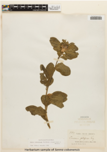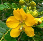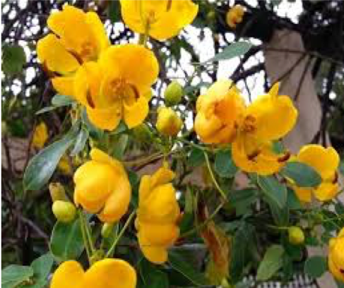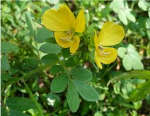 It is a shrub which grows up to 1 meter in height with oblong elliptic shaped compound leaves and has fine hairs over the surface. The leaf axils (base of the leaf) has glands which exudates nectar which is favoured by insects. It bears yellow-orange composite flowers and upon maturity bears legume pods containing to several seeds.