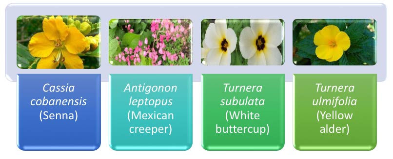 Flowering plants are commonly planted around plantations in Malaysia. They are not only planted for the aesthetic value but more importantly for their benefit in Integrated Pest Management system practised in oil palm plantations. There are 4 types of common beneficial plants planted; Cassia cobanensis (Senna), Antigonon leptopus (Mexican creeper), Turnera subulata (White buttercup) and Turnera ulmifolia (Yellow alder). Among these, Cassia cobanensis is widely regarded as a superior choice.