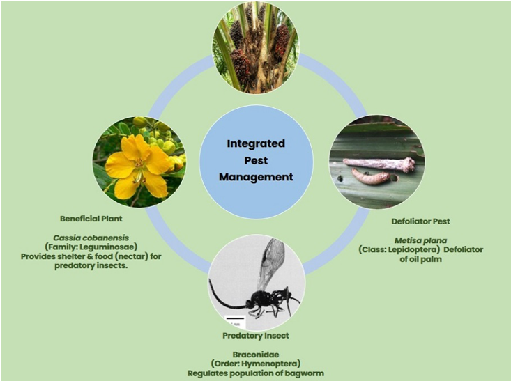 Integrated Pest Management (IPM) is the use of holistic and compatible methods of pest and disease control to reduce crop damage and increase productivity. It uses the most cost-effective methods with minimum hazard and reduced overdependence on pesticides, thus making the management of plantations more sustainable. IPM is adopted in plantation by using biological control agents to control pest infestations and to increase yield productivity in a sustainable manner. This is where beneficial plants play an important role in pest management in oil palm plantations ensures best management of a plantation using eco-friendly and sustainable methods