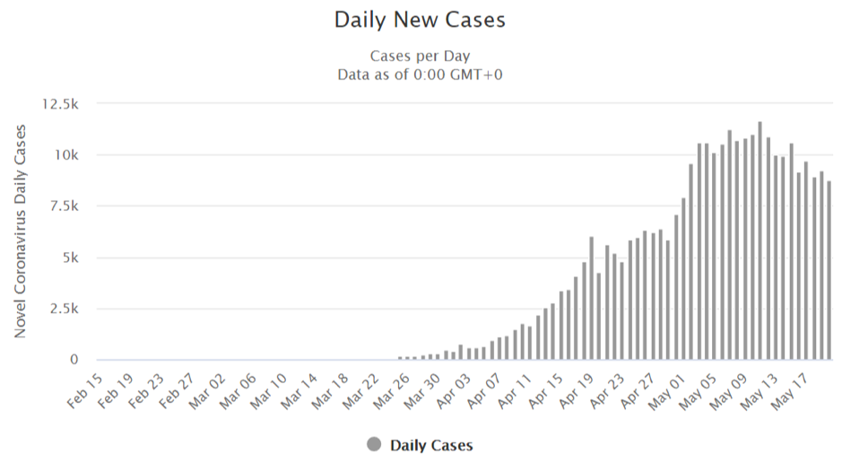 Fig.1 Daily new cases of coronavirus in Russia. Source: https://www.worldometers.info
