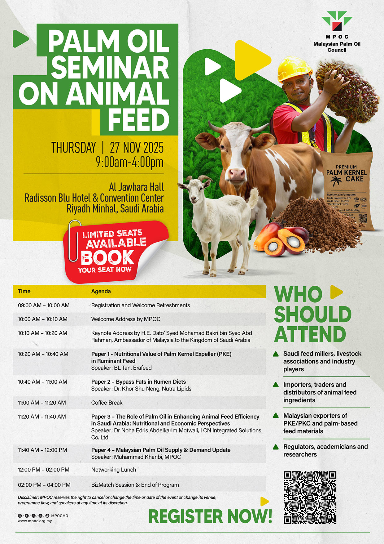 The Malaysian Palm Oil Council (MPOC) is pleased to invite you to the Palm Oil Seminar on Animal Feed, scheduled for Thursday, 27 November 2025, from 9:00 a.m. to 4:00 p.m. at Al Jawhara Hall, Radisson Blu Hotel & Convention Center, Riyadh Minhal, Saudi Arabia. This seminar aims to highlight the nutritional and economic potential of palm-based feed ingredients, including Palm Kernel Expeller (PKE) and Palm Kernel Cake (PKC), in supporting the growth of the animal feed industry. Distinguished speakers will share valuable insights on nutritional applications, market trends, and trade opportunities for Malaysian palm oil products in the Kingdom of Saudi Arabia. The event will also provide a unique platform for networking among feed millers, importers, researchers, and regulatory bodies. Attendance is limited, interested participants are encouraged to register early.