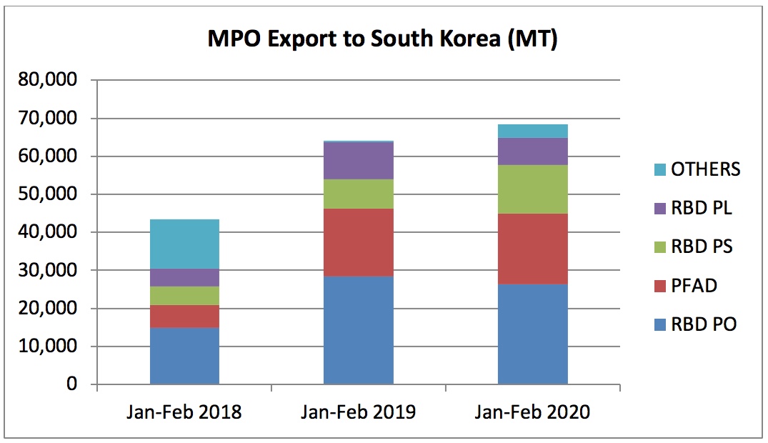Even though, COVID-19 is resulting in decline of sales in the Korean food retail market, however, its impact on palm oil usage in the sector may not be that significant. In Korea, palm oil is largely being used in the commercial sector instead of consumer sector. Even there is a change in the buying pattern of the Korean consumer, the usage of palm oil will remain the same or there might be a possibility of a slight increase, if there is a significant growth in on-line purchases of packed and processed foods such as instant noodles and canned foods. Currently, the statistic shows a significant increase in on-line purchase which is at 98%. If the trends continue, palm oil may have the opportunity to increase in Korean food market. MPOB statistics shows there is a slight increase in export figure for the month of February this year (68,357 MT) compared to the same period last year (64,099 MT).
