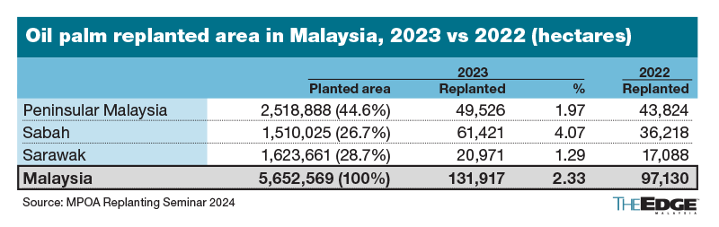 In 2023, only 131,000 hectares were replanted out of an estimated 622,000 hectares that are 25 years or older, marking a mere 2.3% replanting rate. This is alarming, as projections indicate that by 2027, around two million hectares — or 35% of our oil palm area — will consist of trees classified as matured-old, severely impacting yield and increasing operational difficulties. The urgency of this situation cannot be overstated; without timely replanting, the sector risks facing substantial declines in output, impacting not only growers but also the entire supply chain.
