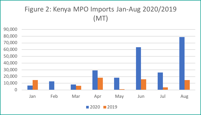 Kenya recorded the largest increase of Malaysian palm oil imports from January to August 2020, importing a total of 243,610 MT of MPO, an increase by 167,461 MT compared to the same period of the previous year. Prior to 2020, Kenya imports palm oil in large numbers typically in September to December for re-stocking activities. This trend is a stark contrast in 2020 whereby palm oil imports has shown a significant increase even as early as the month of April. The increase in imports in the Kenya is mainly attributed to the waiver of CPO export duty by the Malaysian government as evident in the June 2020 imports, which resulted in MPO being more competitively priced compared to other oils. In addition, the locust invasion had destroyed many local staple food crops such as rice, maize, and potato crops, which had led to increase in food demand in the country.