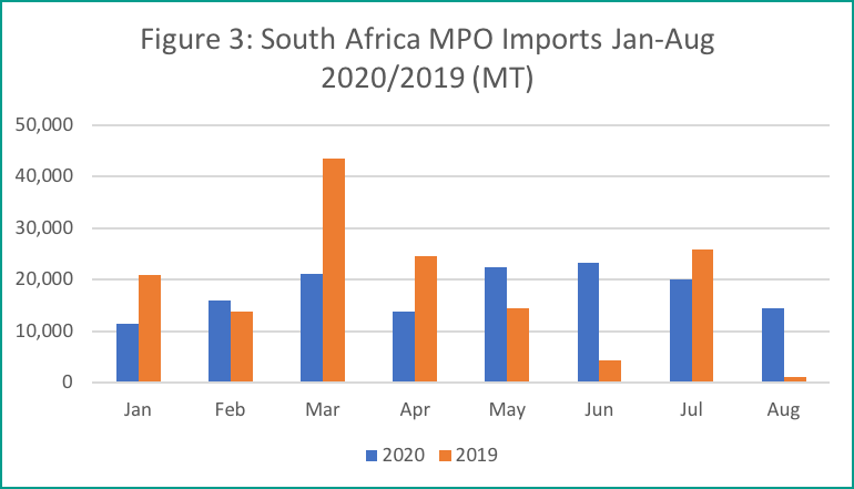 South African MPO imports registered a total of 142,713 MT from the period of January to August 2020, a decline of 4% compared the same period last year. Palm oil is mostly consumed by the retail and HORECA Sector in South Africa, which in an analysis by South Africa – Towards Inclusive Economic Development (SA-TIED) Project estimated that retail sector will experience an estimated decline of 30% to 60% decline in GDP contribution while the HORECA sector will suffer an estimated decline of more than 60%.