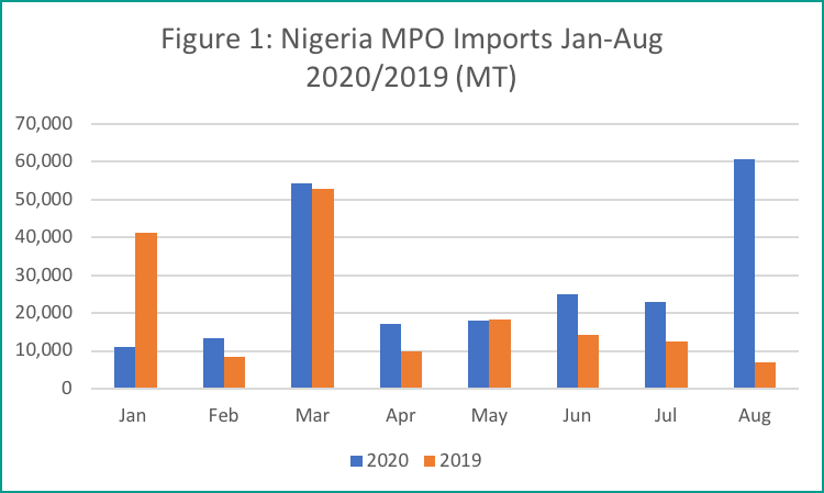 From January to August 2020, Nigeria imported a total of 222,103 MT of Malaysian palm oil, an increase of 34.86% compared to the same period of the previous year. This increase is attributed to the CPO export duty exemption announced by the Government of Malaysia in June 2020 which had benefitted Nigeria greatly as the country is a major CPO importer as seen in July and August import figures above. The international palm oil price decline coupled with the duty exemption has led to imported palm oil being more competitively priced than locally produced oils. Furthermore, a widespread call was made for the empowerment of the Nigerian palm plantation industry. In addition, Nigerian President, Muhammadu Buhari, through his official Twitter account, reiterated Nigeria’s stance on barring food importers (palm oil included) from access to foreign exchange services in September 2020. Keeping in view of these situations, both Malaysian and Nigerian Governments’ policies will become the key driver for palm oil demand in Nigeria. CPO export duty exemption had greatly benefitted in Malaysian palm oil exports to the country and the exemption will continue until the end of 2020. However, should the Nigerian Government introduce new policies with regards to Nigerian palm oil development, it may impact the palm oil imports into the country.