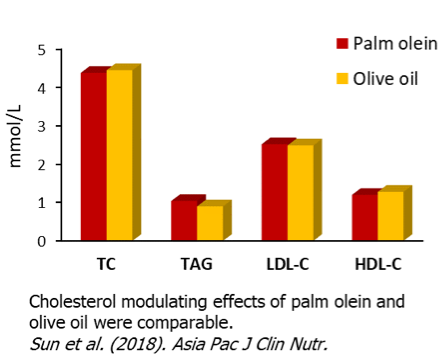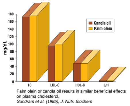 There are also published human clinical studies that equate palm oil with other oil low in saturated fats such as olive oil and canola oil for similar outcomes on total, LDL and HDL cholesterol in humans.