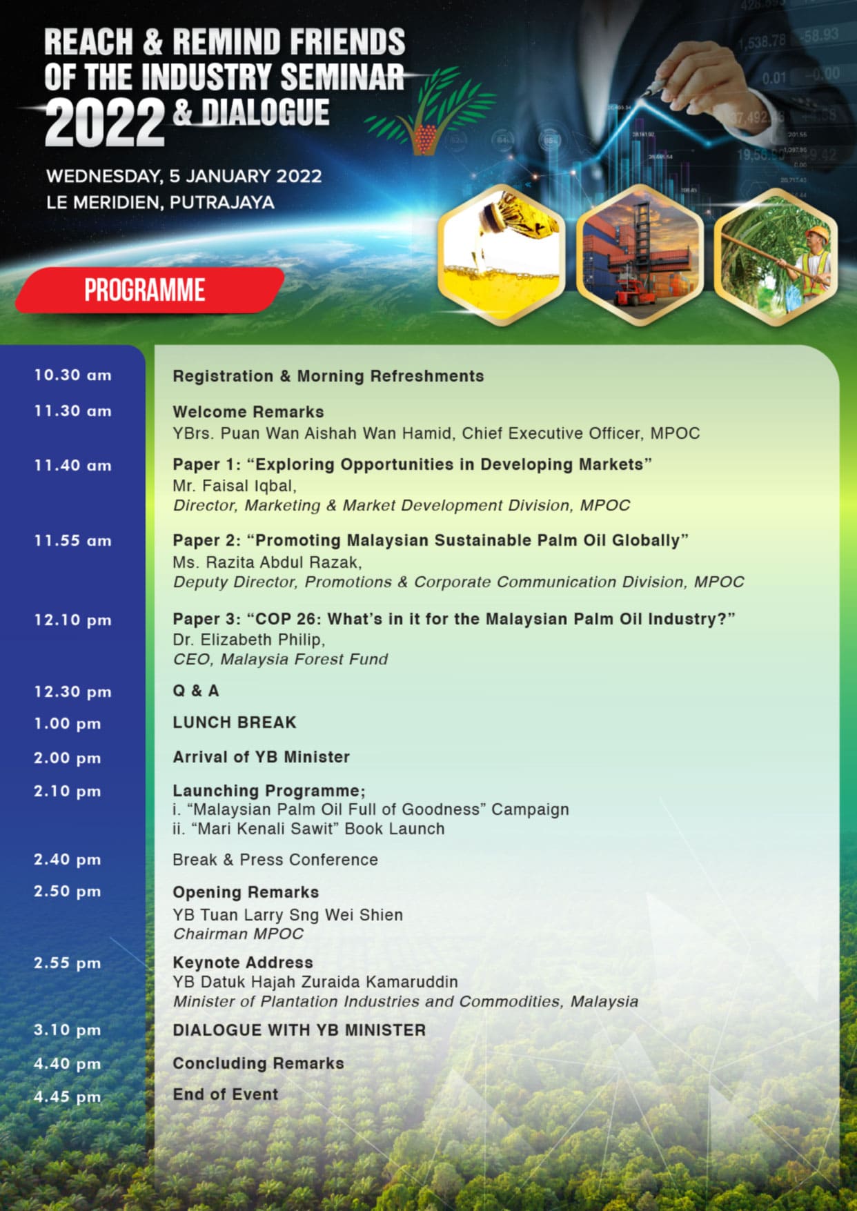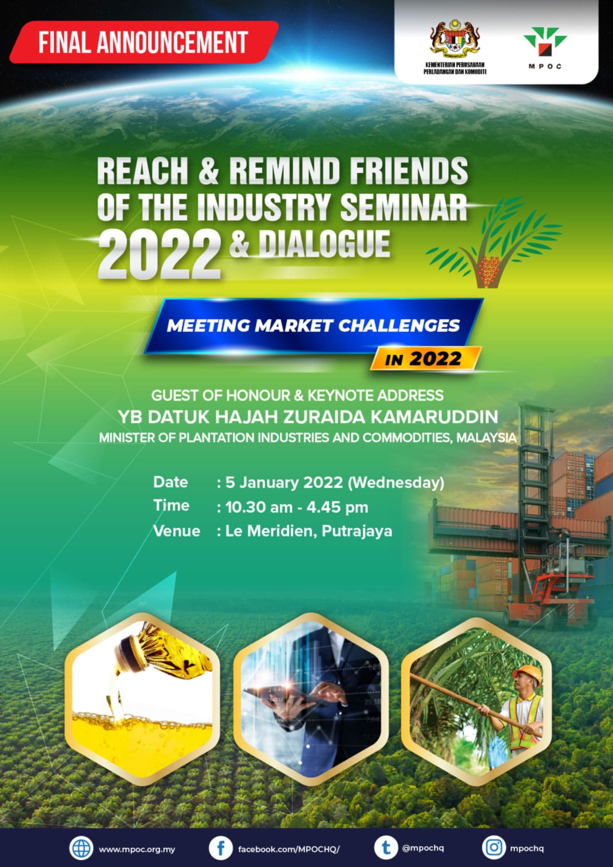 Reach & Remind, Friends of the Industry Seminar 2022 and Dialogue is an annual seminar organised by Malaysian Palm Oil Council (MPOC) with the objective to highlight the important issues and opportunities in the Malaysian palm oil industry by way of a seminar –cum- dialogue and also exhibition. The keynote address will be presented by YB Datuk Hajah Zuraida Kamaruddin, Minister of Plantation Industries and Commodities, Malaysia to set out the industry’s direction for the year 2022. Three papers by distinguished speakers will be presented covering wide spectrum of issues of the Malaysian palm oil industry and the challenges involved. An open dialogue between the YB Minister and the industry players will also be facilitated for further discussions on issues and challenges foreseen for the year. An exhibition will also be held to showcase the initiatives undertaken by MPOC.