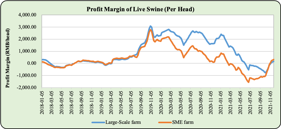 The sharp drop in profit margin in swine farming due to increased supplies & rising feed cost