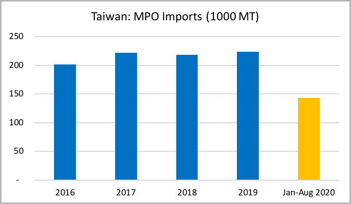 For the period of January to August 2020, the import of Malaysian palm oil by Taiwan showed a slight dropped of 3,961 MT or 2.7% compared to the same period in 2019. This drop was mainly due to the demand disruption caused by global pandemic outbreak, COVID-19.