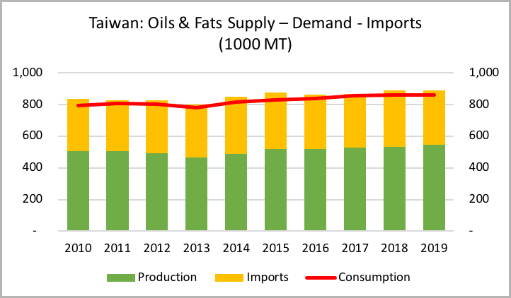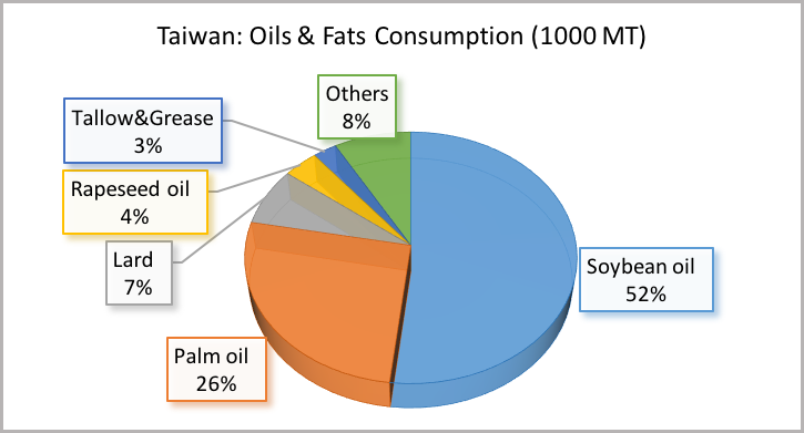 With a population of 23.8 million, Taiwan consumed 860,000 MT of oils and fats in 2019. Soybean oil and palm oil are the main consumed edible oils with a share of 52% and 26% respectively. Soybean oil is the most produced oil in the Taiwan with an average production was 460,000 MT yearly for the last five years. Due to the limited arable land and small agricultural sector, most of the soybean oil production in the Taiwan is crushed from the imported soybeans. Taiwan imported 2.7 million MT of soybean in 2019 which the biggest suppliers are USA (1.8 million MT) and Brazil (773,700 MT) which the total share of these two countries was at 97.4%.