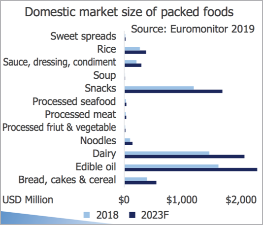 As the world becomes more fast-paced, consumers are quickly adapting to new circumstances that have led to new food requirements. Packaged and convenient food industries have seen growing demand in recent years and Bangladesh is one of the countries that is embracing this new trend. From a market size of USD3.0 billion back in 2013, the market size of the domestic packaged food sector in Bangladesh has grown to USD5.2 billion in 2018 and it is projected to reach USD7.3 billion in 2023. In the packaged food market, edible oils, dairy products, and snacks are the sectors with the highest sales values. The products are expected to see a continuous growth of 6% in 2023. Other sectors that will see rapid sales growths include processed fruits and vegetables, seafood, and meat, with projected growths to be between 8-13% respectively.