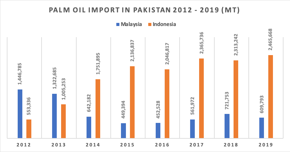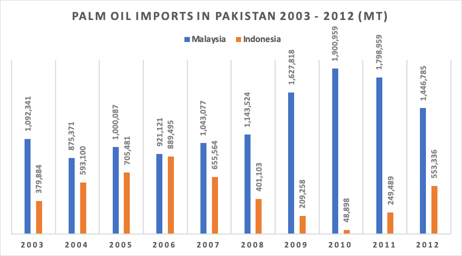 Pakistan is a net importer of edible oil and palm oil constitutes more than 95% of the total imports of oils and fats. Indonesian exporters started tapping into the Pakistani market in early 2000 and by the end of 2006, their market share rose to approximately 50%. The following chart shows the steady increase in the exports of Indonesian palm oil to Pakistan and the shift in the market trend after the Malaysia – Pakistan FTA came into effect:
